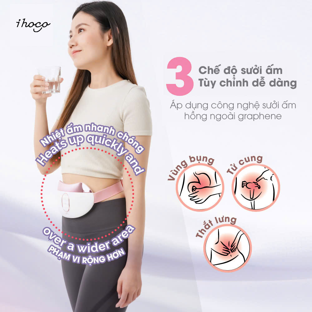 Điều đặc biệt ở công nghệ này là khả năng làm ấm sâu vào cơ thể mà không gây cảm giác khó chịu hay nóng quá mức. Điều này giúp IHOCO BellaX trở thành một công cụ tuyệt vời cho những người bị đau bụng kinh, đau lưng, hoặc những ai thường xuyên phải ngồi lâu trong tư thế sai khiến cơ thể mỏi mệt.
