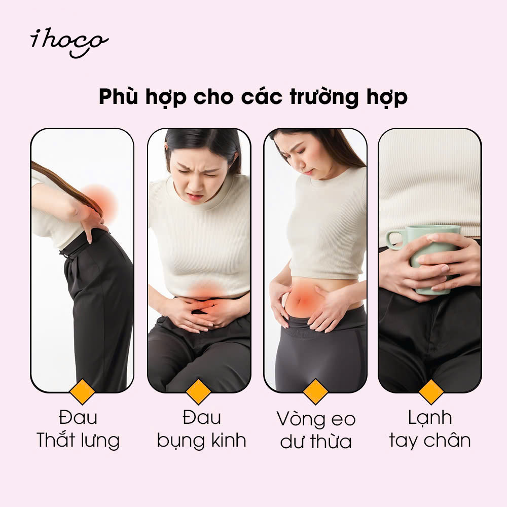 Chế độ làm ấm của đai massage IHOCO BellaX giúp giảm đau bụng kinh hiệu quả nhờ công nghệ nhiệt hồng ngoại Graphene. Phụ nữ có thể sử dụng đai để giảm cơn đau bụng kinh, giúp cơ thể thư giãn và dễ chịu hơn trong những ngày này. - Người Thường Xuyên Đau Lưng, Đau Cơ Bắp: