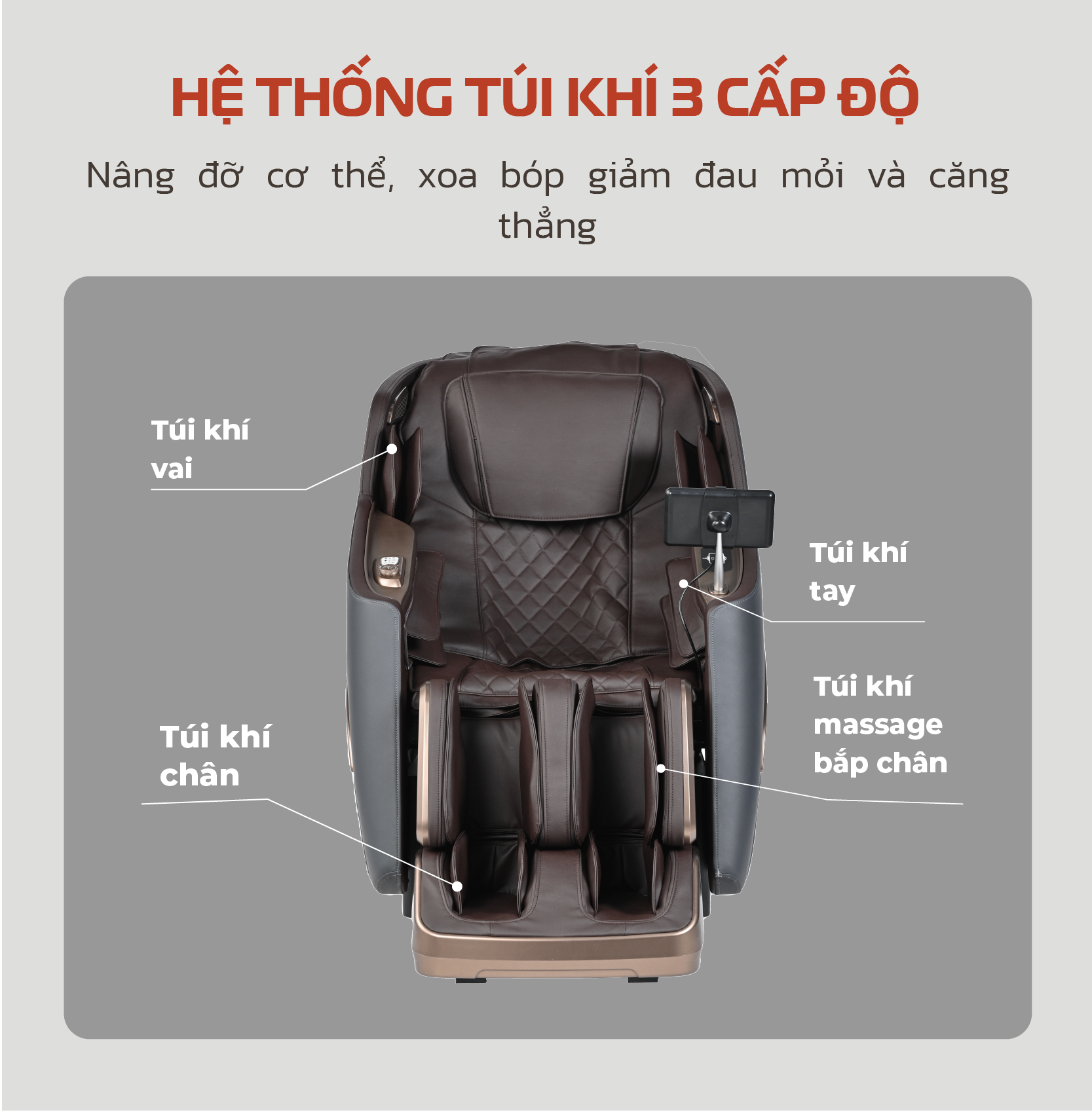 Hệ thống túi khí massage được phân bố trải dọc toàn thân. Các túi khí ở vai, tay, chân xoa bóp nhịp nhàng tác động sâu đến từng bộ phận trên cơ thể nhất là những vùng cơ mềm. Nhờ đó giúp giảm nhanh các cơn đau nhức, kích thích lưu thông tuần hoàn má. Đồng thời giúp ngăn ngừa suy giãn tĩnh mạch, phù nề và chuột rút.
