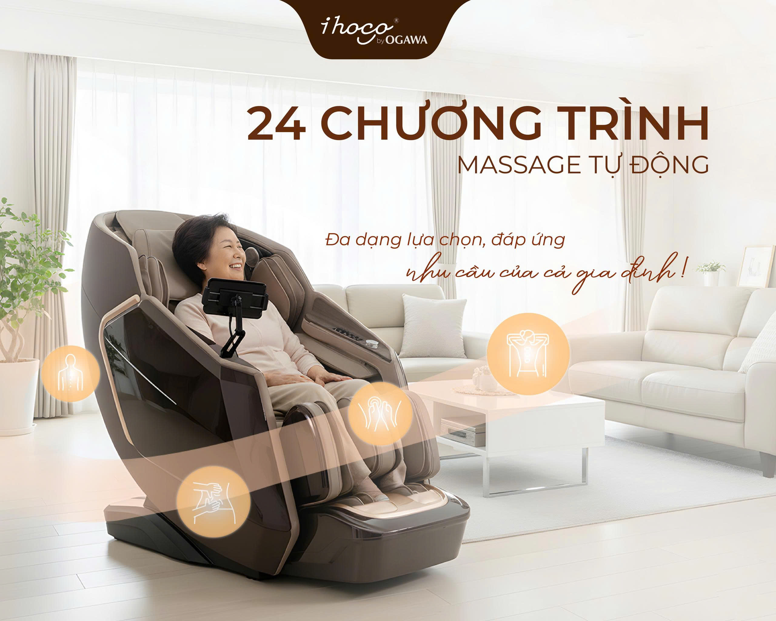 Ghế massage IH-1194 có đến 24 chế độ massage tự động, mỗi lần sử dụng đều là một trải nghiệm hoàn toàn khác biệt. Từ những lúc bạn cần thư giãn nhẹ nhàng sau ngày dài làm việc, đến những lúc cơ thể căng cứng cần massage sâu để phục hồi năng lượng, IH-1194 đều đáp ứng linh hoạt mọi nhu cầu.
