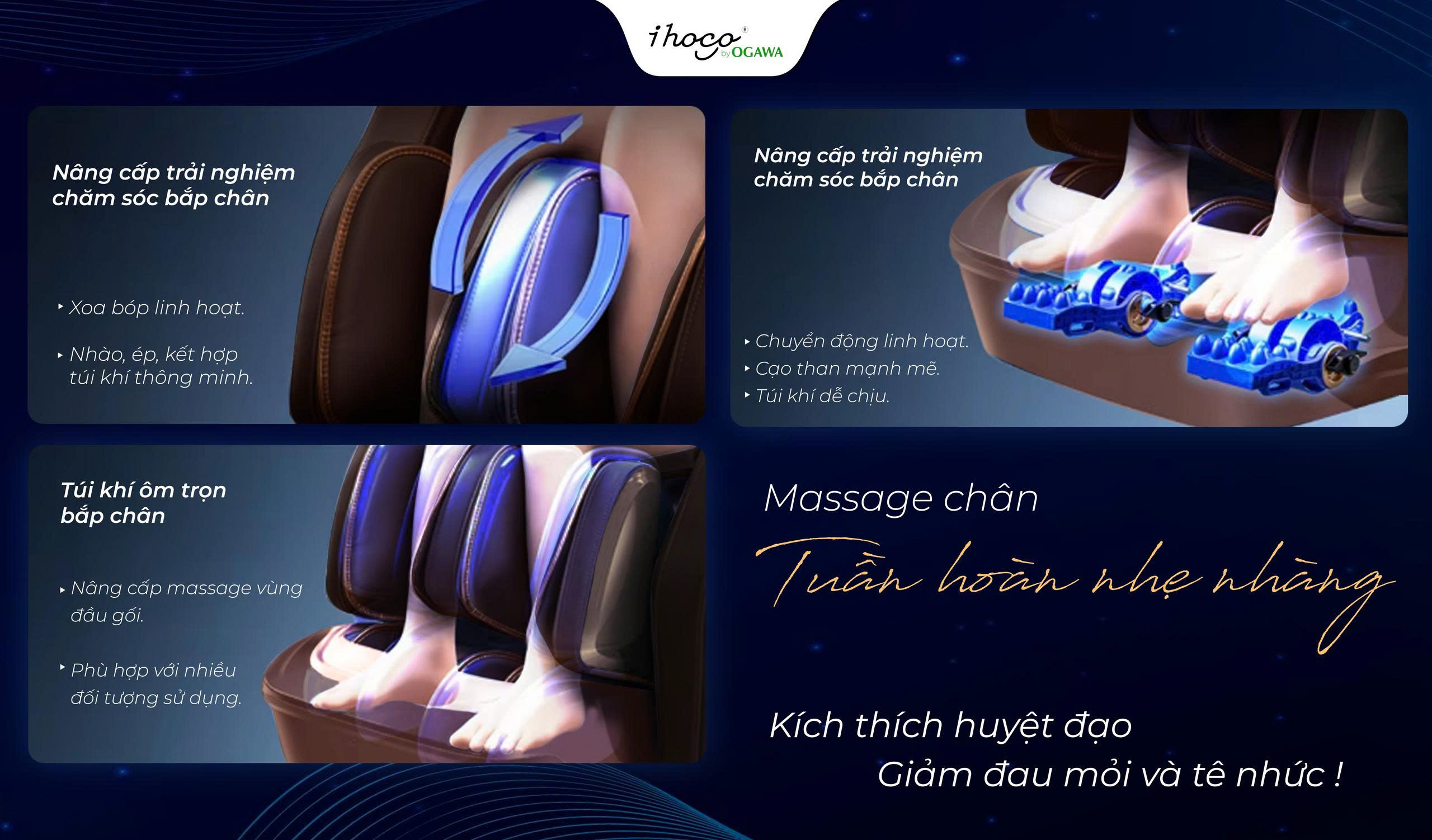 Cơ chế xoa bóp, bóp nhả tự nhiên từ các túi khí kết hợp con lăn tác động đa điểm giúp kích thích lưu thông máu, giảm tê bì, cải thiện tình trạng suy giãn tĩnh mạch – đặc biệt hữu ích cho người cao tuổi, dân văn phòng, người thường xuyên mang giày cao gót hoặc phải đứng lâu.
