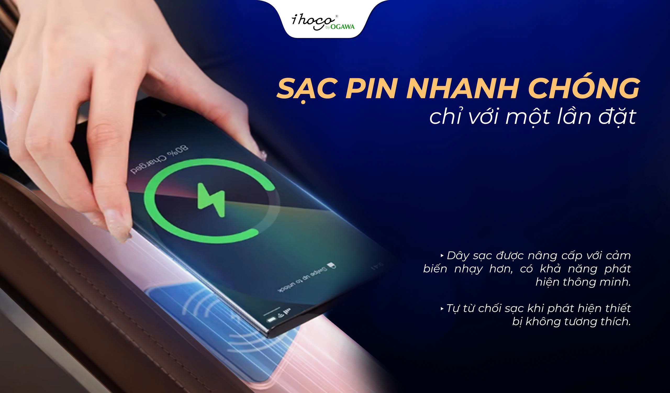 Trong thời đại công nghệ số, sự tiện nghi không chỉ đến từ chiếc ghế massage mà còn từ cách nó hòa vào lối sống hiện đại của bạn. Hiểu rõ điều đó, IHOCO IH-1438 được tích hợp tính năng sạc nhanh không dây, cho phép bạn dễ dàng đặt điện thoại lên khay sạc tích hợp trong lúc thư giãn.
